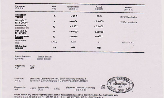產品特點:多項專利技術應用于生產中,產量高、雜質少、質量穩定、高濃度甲酸含量可達99.5%以上。